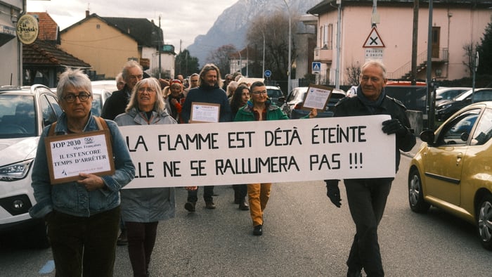 Le collectif citoyen JOP 2030 était présent lundi dernier à Albertville pour alerter sur les enjeux des Jeux olympiques d’hiver 2030 dans les Alpes françaises, à l’occasion du retour de la flamme olympique en Savoie.